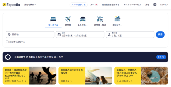 エクスペディアは、海外ホテルやツアー、航空券の選択肢が多く、旅程をまとめて検討したい方と相性のよいサービスです。デルタ航空を利用する旅行でも、ホテルや現地移動をあわせて探したいときに使いやすいでしょう。